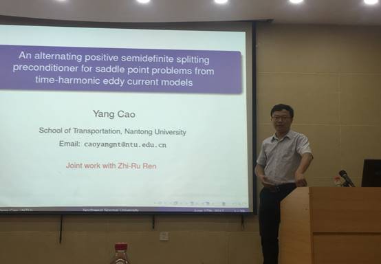 6月17日,应太阳成集团tyc邀请,南通大学曹阳副教授来公司在教学9号楼C101学术报告厅作了题为《An alternating positive semidefinite splitting preconditioner for saddle point problems from time-harmonic eddy current models》的学术报告。报告会由太阳成集团tyc张贵仓教授主持,相关专业师生40余人参加了此次报告会。