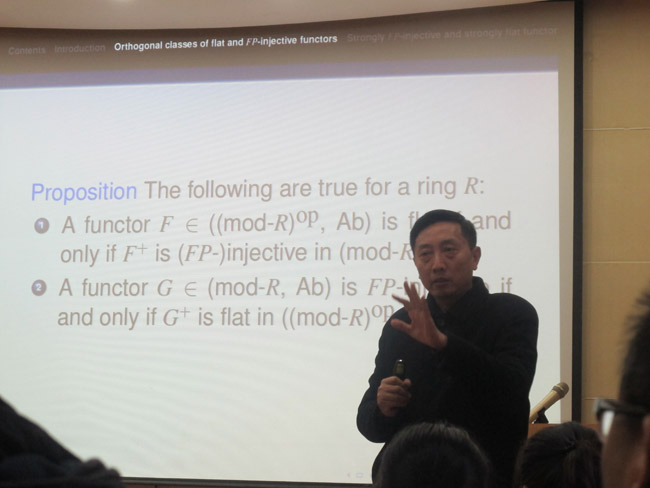 报告中,毛立新教授从函子范畴的基本定义讲起,谈到了函子范畴中重要对象的相关表示,详细地讲解了如何用函子范畴的语言来刻画各种重要的环,最后介绍了函子范畴在同调维数方面的研究进展。