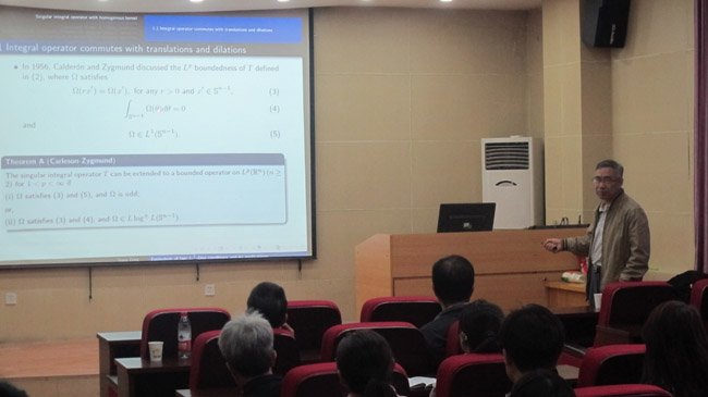 报告中,丁勇教授首先从带齐型核的奇异积分算子的有界性背景讲起,介绍了由旋转和平移生成的两类L^1-Dini条件,同时给出了这两类L^1-Dini条件等价性的证明思路及结果。最后,丁勇教授回顾总结了Hilbert变换及Riesz变换有界性最佳常数问题、中心极大函数的有界性问题等相关结论,并应用L^1-Dini条件改进了Janakiraman关于一类奇异积分算子的有界性结果以及带L^1-Dini核的极大算子的弱(1,1)型估计结果。