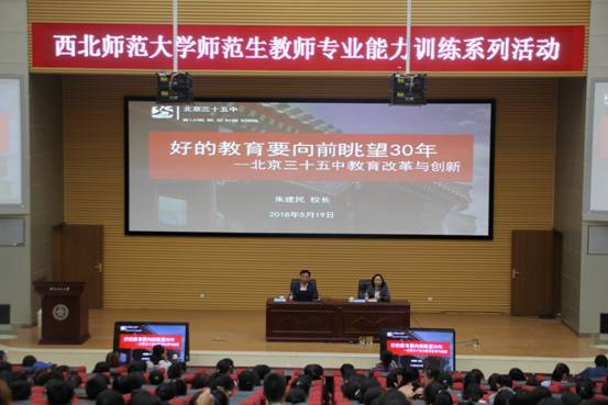 2018年5月19日,北京三十五中朱建民董事长应师范生专业技能训练中心邀请,在新校区毅然报告厅为公司师生做了题为“好的教育要向前眺望30年”的专题报告。部分教师、本科生、研究生共计600余人聆听了报告。公司党委书记常正霞主持了报告会。