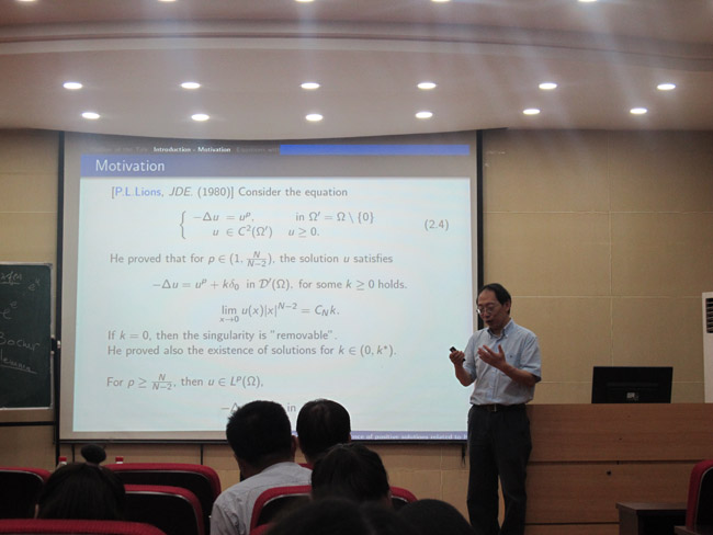 应公司邀请,华东师范大学周风教授于2018年6月13日至17日到公司进行学术交流。学术交流期间,于6月13日做了题为“与Hardy-Leray算子相关的椭圆方程正解的存在性/非存在性”的学术报告。周风教授从研究问题的动机、具有Hardy-Leray位势的方程及具体应用三方面做了此次报告。报告中,周教授详细讲解了Kelvin变换和有界区域内Hardy位势问题的非存在性结论,获得了带洞区域或R^3(n大于等于3)的外部区域上的线性椭圆方程正上解的非存在性,以及具体应用中某些线性和非线性椭圆方程、椭圆系统最优正上解的非存在性。报告会由太阳成集团tyc马如云教授主持,相关专业师生40多人参加了报告会。