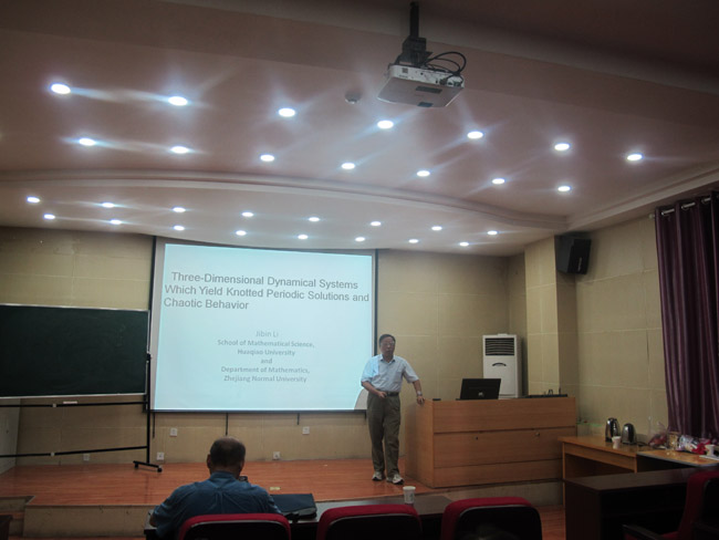 报告中,李继彬教授首先介绍了扭结以及(m,n)-环结的定义进而介绍了产生扭结周期轨道的三维动力系统等相关知识,最后介绍了扰动系统的混沌行为等一系列最新研究成果及相关内容。