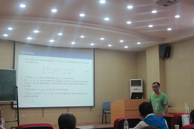 报告中,陈虎元教授首先回顾了分数阶椭圆方程的研究进展、研究方法以及还未解决的主要问题。然后介绍了自己和周风教授等人合作在Kirchho型椭圆方程孤立奇点等问题研究中的主要工作。最后分享了自己求学经历以及研究的心得。