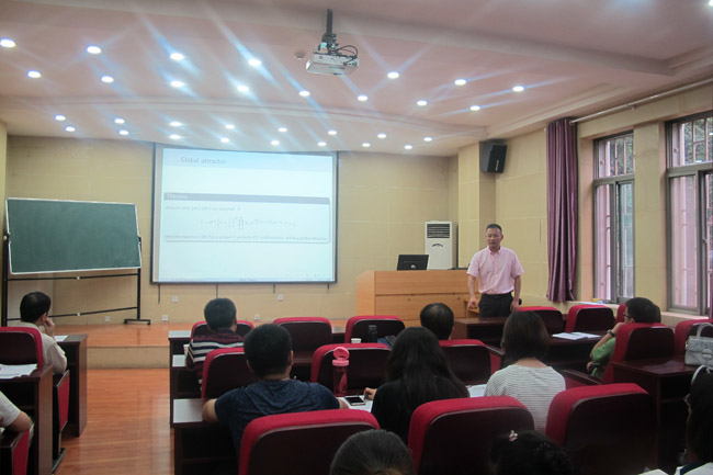 报告中,王锦荣教授首先介绍了线性方程及其扰动方程的定性和稳定性理论及其Lyapunov正则性;其次介绍了非线性方程解在欧氏空间和轨道Hausdorff空间中的连续依赖性及其稳定性结果;接下来介绍了一阶和二阶半线性发展方程温和解的存在性与稳定性理论;最后介绍了自治和非自治发展方程周期解及相应的动力学行为。