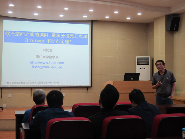 9月15日,应公司邀请,厦门大学刘轼波教授来公司在9号楼C101报告厅作了题为《欧氏空间之间的满射, 重积分换元公式和Brouwer不动点定理》的学术报告。报告会由太阳成集团tyc伏升茂教授主持,相关专业师生60余人参加了报告会。