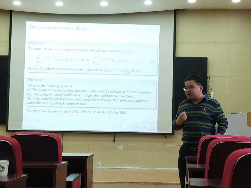 报告中,杨新光副教授首先介绍了非线性演化方程解的长时间行为的研究背景与研究现状,然后介绍了拉回吸引子理论及其能量估计方法,并介绍了在二维NS方程中的应用,最后给出了几个值得研究的问题。