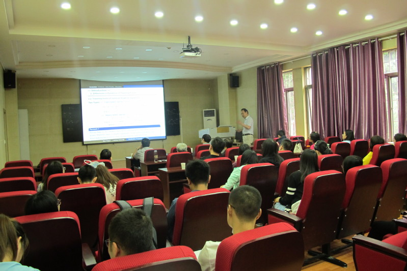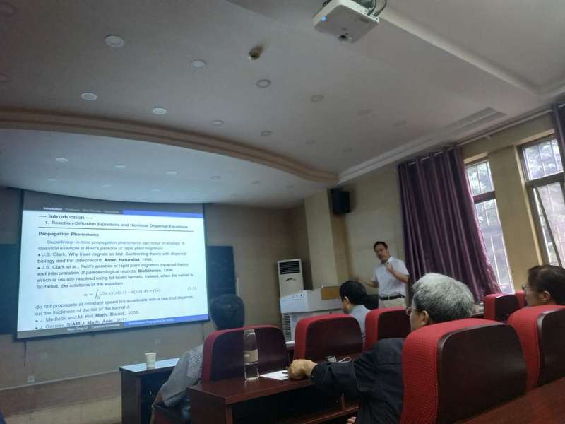 李万同教授主要介绍了反应扩散合作系统中的快速扩散现象的最新研究结果。他首先谈到了在反应扩散方程中的由于初始函数或非局部扩散核的选取导致新的快速传播现象的出现。接着介绍了在非局部扩散合作系统中发现的这种快速传播现象。最后给出了一些需要进一步研究的问题。报告结束后,李万同教授就与会师生提出的相关问题作了解答。