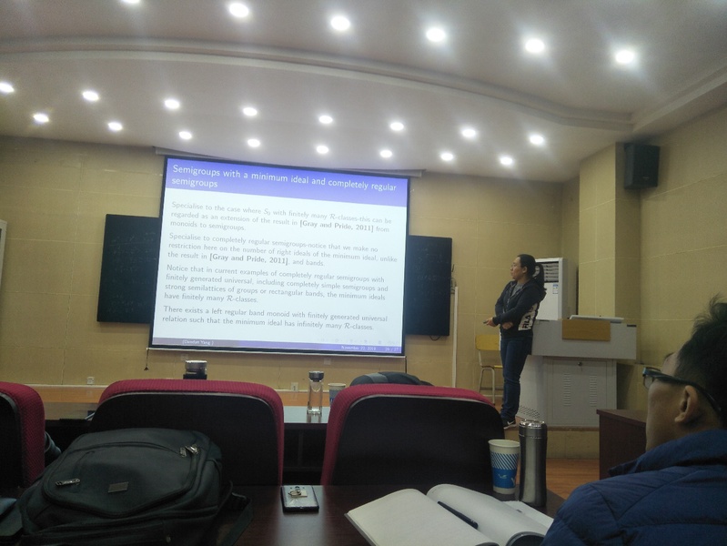 在报告中,杨丹丹教授主要介绍了半群上泛左同余提出的理论背景,以及报告人在泛左同余相关公开问题研究中取得的主要成果。同时,结合自己的研究工作经历,杨丹丹教授分享了自己的研究体会。报告结束后,杨丹丹教授就与会师生提出的相关问题作了解答,并与公司师生进行了广泛的交流和讨论。