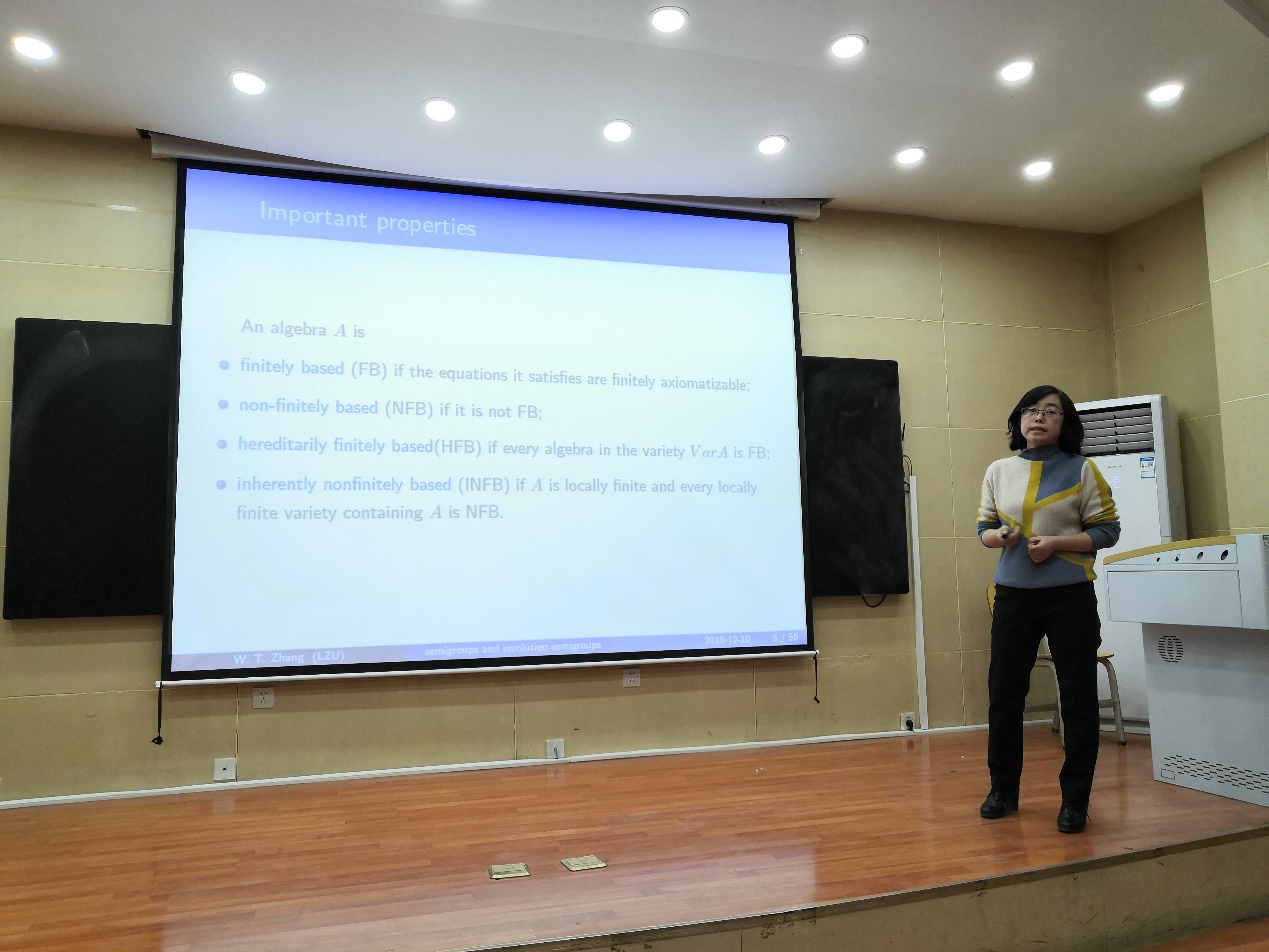 12月10日下午,应公司邀请,兰州大学太阳成集团tyc张文婷副教授莅临公司进行学术交流,在九号楼C101学术报告厅作了题为《The finite basis problems for semigroups and involution semigroups》的学术报告。报告会由乔虎生教授主持,相关专业师生20余人参加了此次报告会。