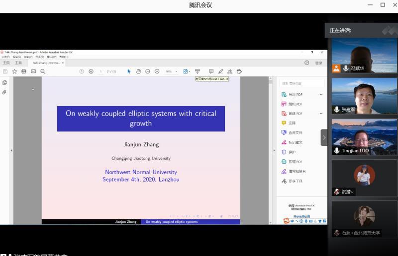 9月4日,应公司邀请,重庆交通大学张建军教授在线为公司师生作了题为《On weakly coupled elliptic systems with critical growth》的学术报告。报告会由公司冯斌华副教授主持,相关专业师生50余人参加了此次报告会。