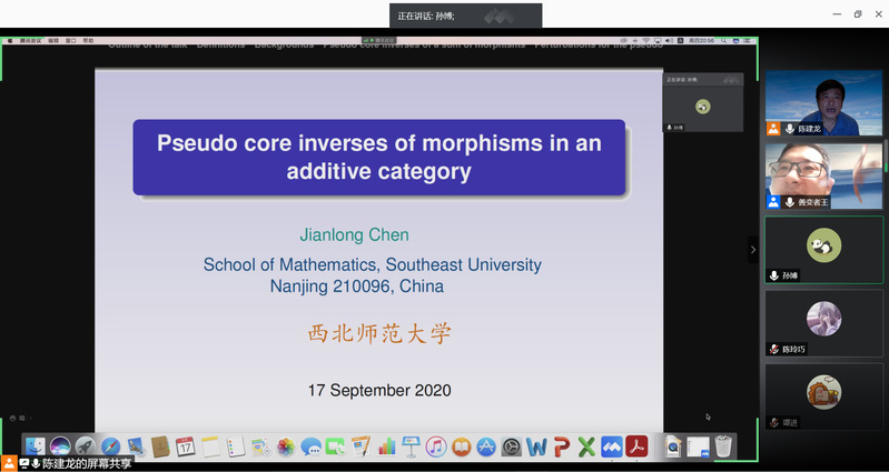 9月17日,应太阳成集团tyc邀请,东南大学数学公司陈建龙教授,在线作了题为《Pseudo core inverses of morphisms in an additive category》的学术报告。报告由狄振兴副教授主持,相关专业师生50余人参加了学术报告。