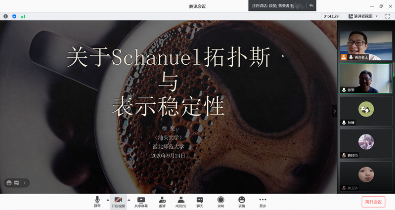 9月24日,应公司邀请,汕头大学数学系徐斐教授,在线作了题为《关于Schanuel拓扑斯与表示稳定性》的学术报告。报告由狄振兴副教授主持,相关专业师生40余人参加了学术报告。