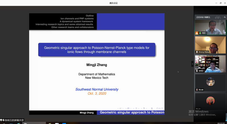 10月3日,应公司邀请,美国新墨西哥矿业与理工大学张明吉教授在线为公司师生作了题为《Geometric singular approach to Poisson-Nernst-Planck type models for ionic flows through membrane channels》的学术报告。报告会由陈鹏玉副教授主持,相关专业师生40余人参加了此次报告会。