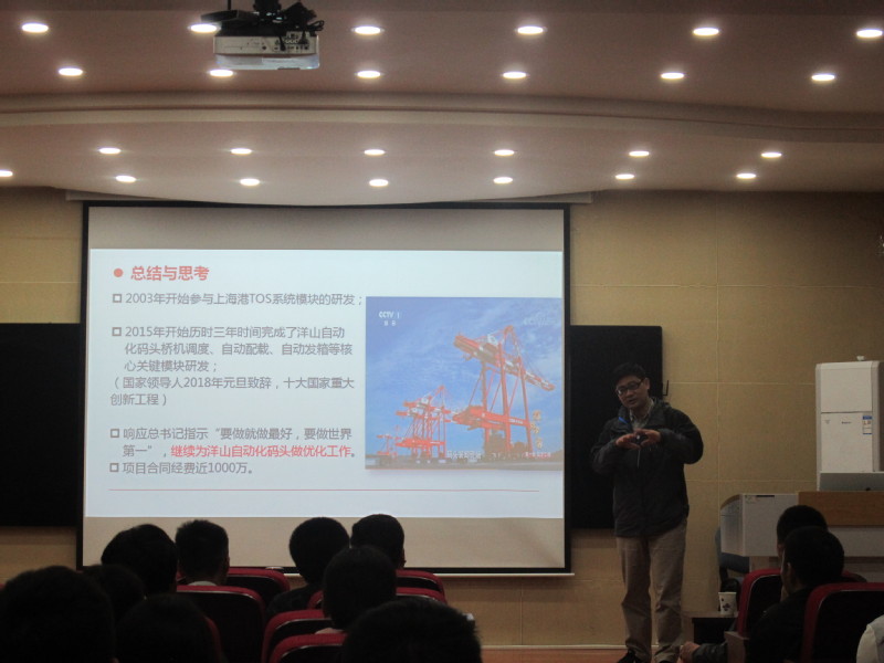 讲座中吕长虹教授围绕“数字港口的发展现状和数学需求”这个话题,对发展现状作了较全面讲述,介绍了码头操作系统(TOS)是码头生产运营的“大脑系统”,是港口的核心竞争力,码头操作系统的研发涉及许多离散问题的优化算法,并强调“TOS”是我国自主研发并成功运用于实践,同时也指出在国家“一带一路”战略中港口领域仍存在诸多短板;以泊位分配和自动牵引车的路线规划两个模块为例,介绍其中的数学需求,进而引出“带状二维装箱问题、混合整数线性规划、图的最短路问题、稳定匹配问题”等图论与组合中的最优化问题。