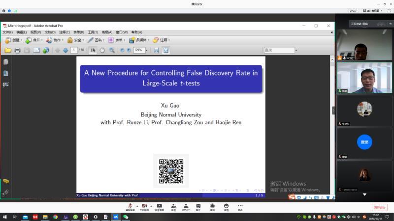 10月15日下午,应公司邀请,北京师范大学郭旭教授在线为公司师生作了题为《A New Procedure for Controlling False Discovery Rate in Large-Scale t-tests》的学术报告。报告会由田玉柱副教授主持,统计学专业师生20余人参加了此次报告会。
