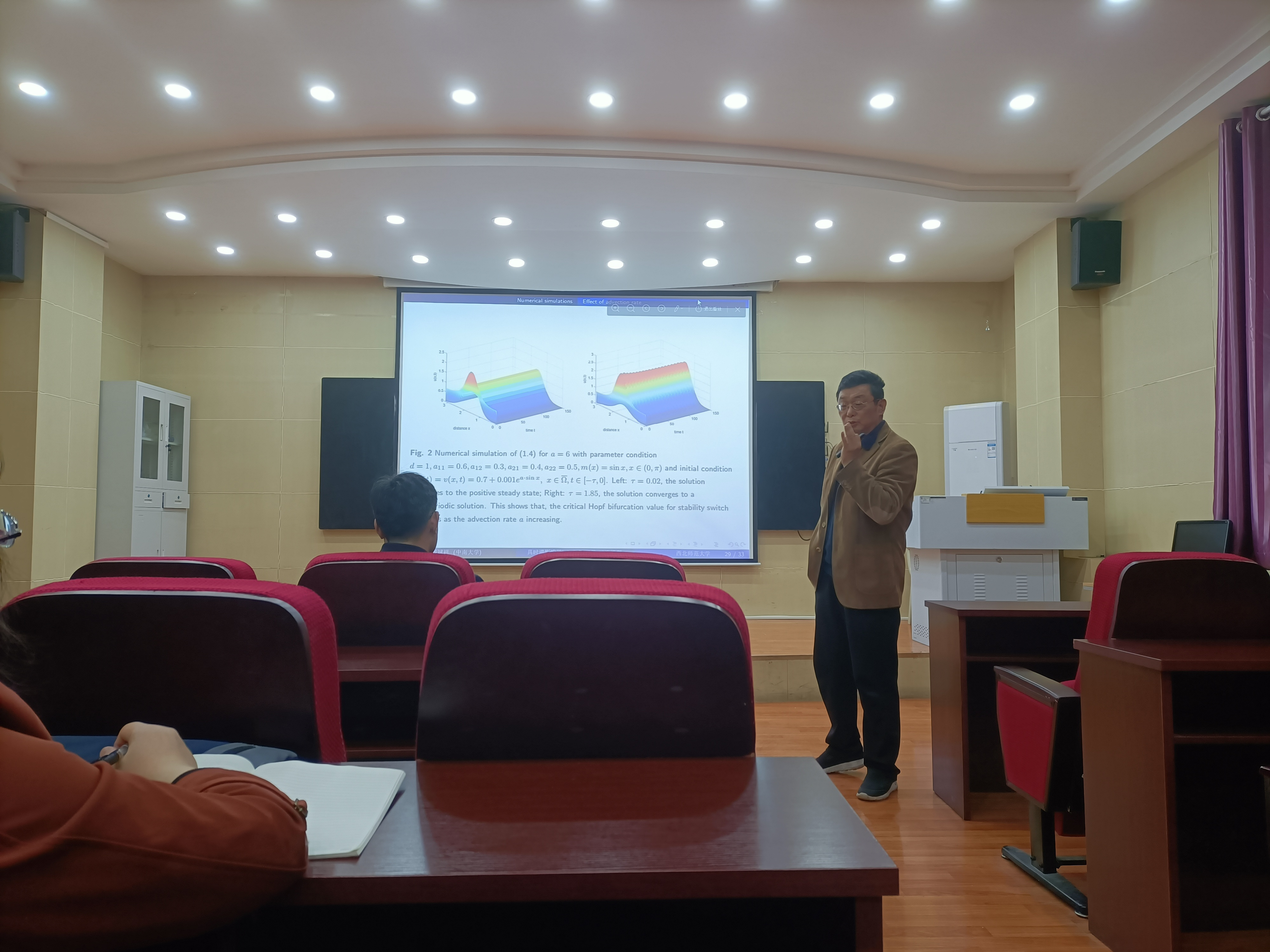 戴斌祥教授首先介绍了带有时滞效应的两种群Lotka-Volterra竞争-扩散-对流模型的相关背景和研究动向,接着向大家展示了如何利用隐函数定理,在一定的参数条件下,得到至少一个空间非齐次正稳态解的存在性。通过分析相应的特征方程,证明了该空间非齐次正稳态解的局部稳定性和Hopf分支的出现。然后介绍了不存在时滞时,如何研究正稳态解的全局稳定性。最后,通过数值模拟验证了理论分析结果。