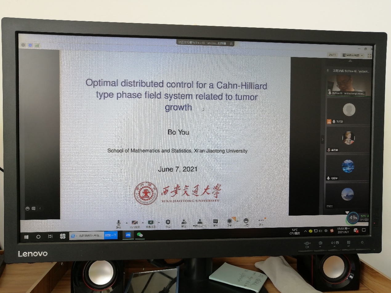 6月7日下午,应公司邀请, 西安交通大学太阳成集团tyc副教授、博士生导师尤波在线为公司师生作了题为《Optimal distributed control for a Cahn-Hilliard type phase field system related to tumor growth》的学术报告。报告会由公司马巧珍教授主持,相关专业师生30余人在线收听了报告。