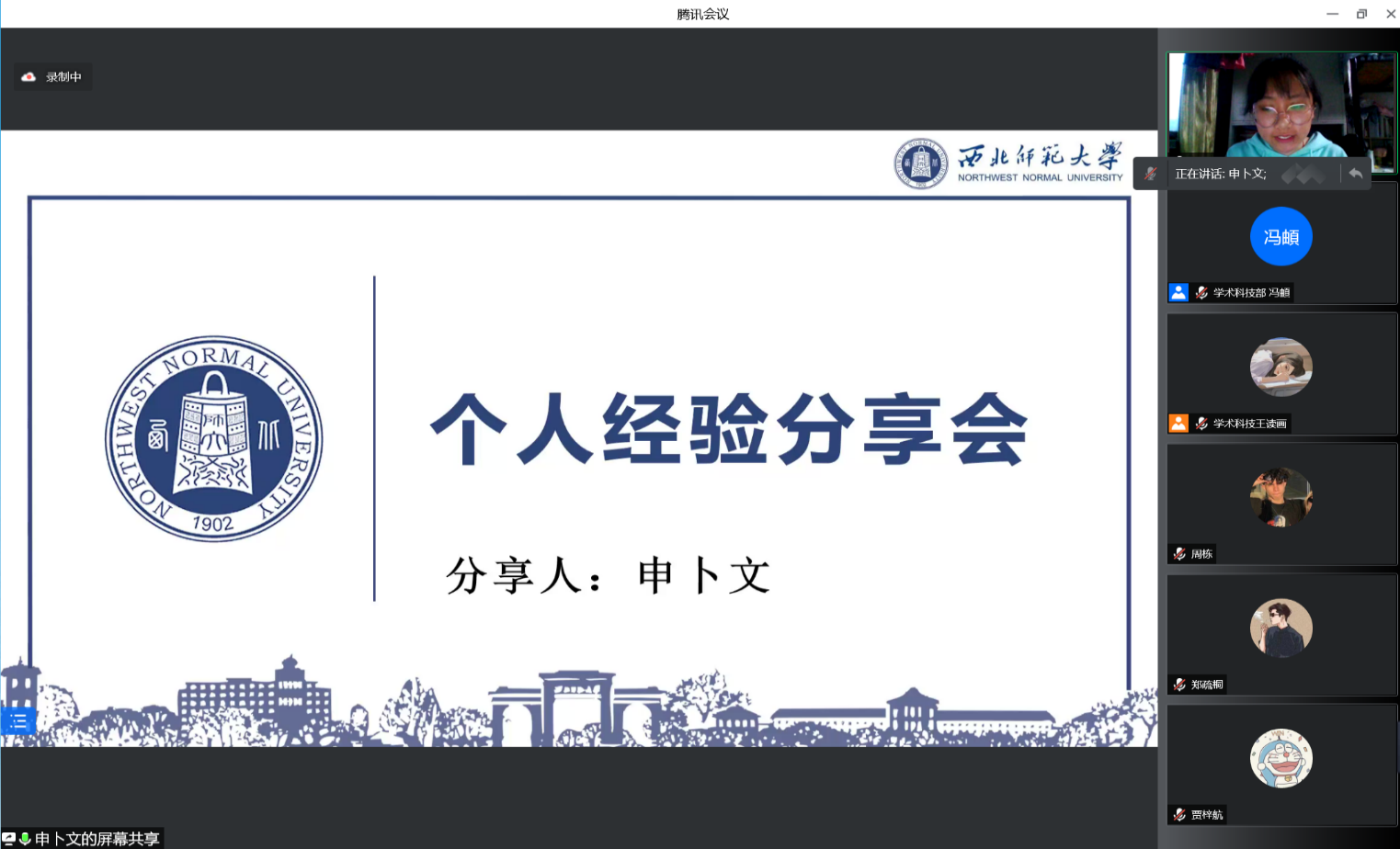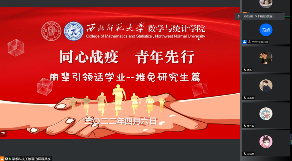 第一期分享会为推免研究生篇,于4月6日晚19:30以腾讯会议形式进行。2018级数学与应用数学1班申卜文、数学与应用数学2班蔡姝旎、数学与应用数学3班李心坡、数学与应用数学4班秦佳丽和信息与计算科学1班贾梓航五位同学分享了各自的学习经验。