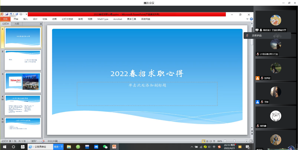 本期分享会为求职经验分享篇(一),于4月21日晚19:30在腾讯会议进行,公司分别邀请了2018级数学与应用数学3班陈曦、2018级信息与计算科学1班郭珂珂、段文文、王慧四位同学作为代表为学弟学妹们分享求职的心得与经验。