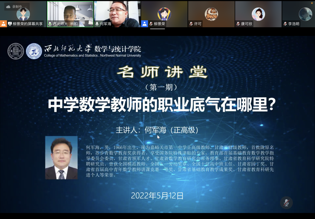 5月12日晚,公司名师讲堂系列讲座第一期正式开讲!嘉峪关市第一中学正高级教师何军海老师受邀为公司500余名员工在线作了题为《中学数学教师的职业底气在哪里?》的报告。报告由公司主管教学副经理杨和教授主持。