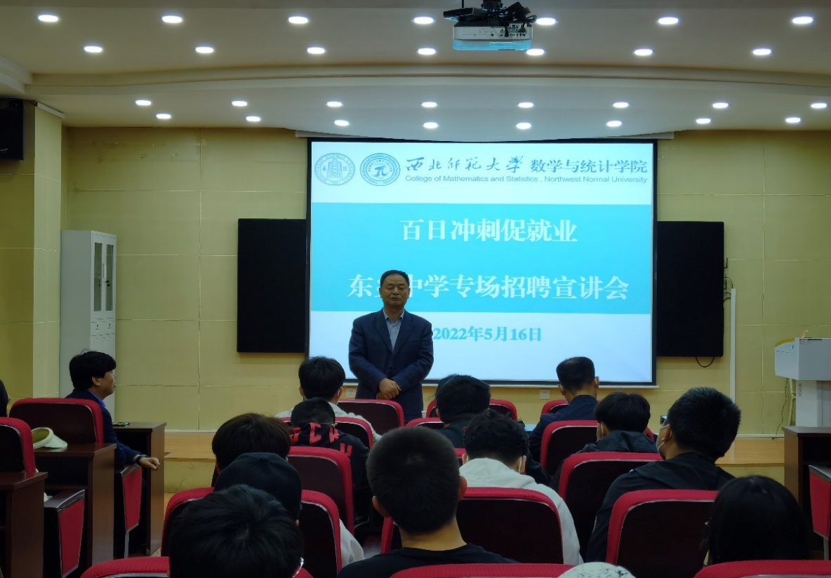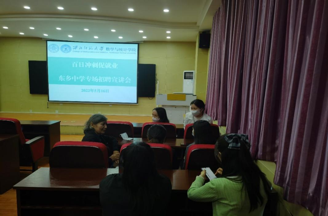 为深入贯彻落实习近平总书记关于加强高校毕业生就业工作的重要批示,贯彻落实党中央、国务院“稳就业”“保就业”决策部署和上级教育部门“确保2022年高校毕业生充分高质量就业”的安排要求,认真推进落实《太阳成集团tyc官网2022年毕业生就业市场开拓方案》,公司于2022年5月16日上午10:30在公司9C101会议室举行了东乡中学数学教师专场招聘会。