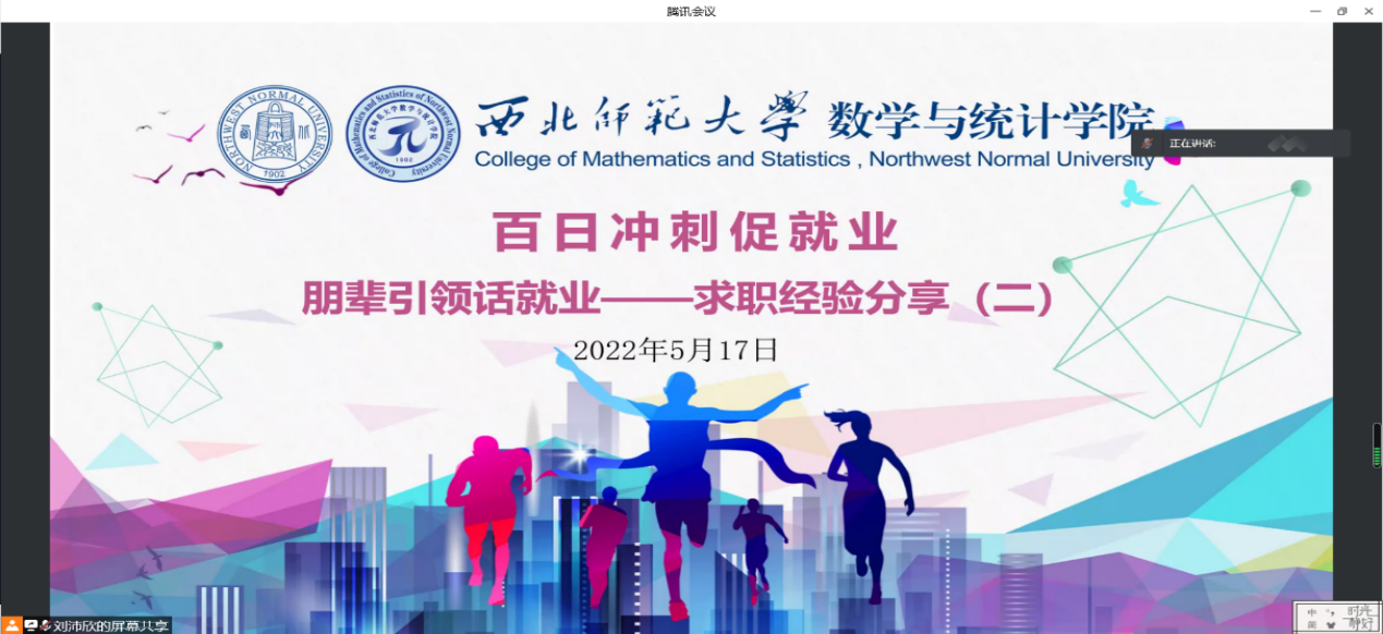本期分享会为求职经验分享篇(二),于5月17日晚20:00在腾讯会议进行,公司分别邀请了2018级数学与应用数学1班魏莉杰、2018级数学与应用数学3班张欢欢、2018级数学与应用数学4班刘嘉琪三位同学作为代表为学弟学妹们分享求职的心得与经验。