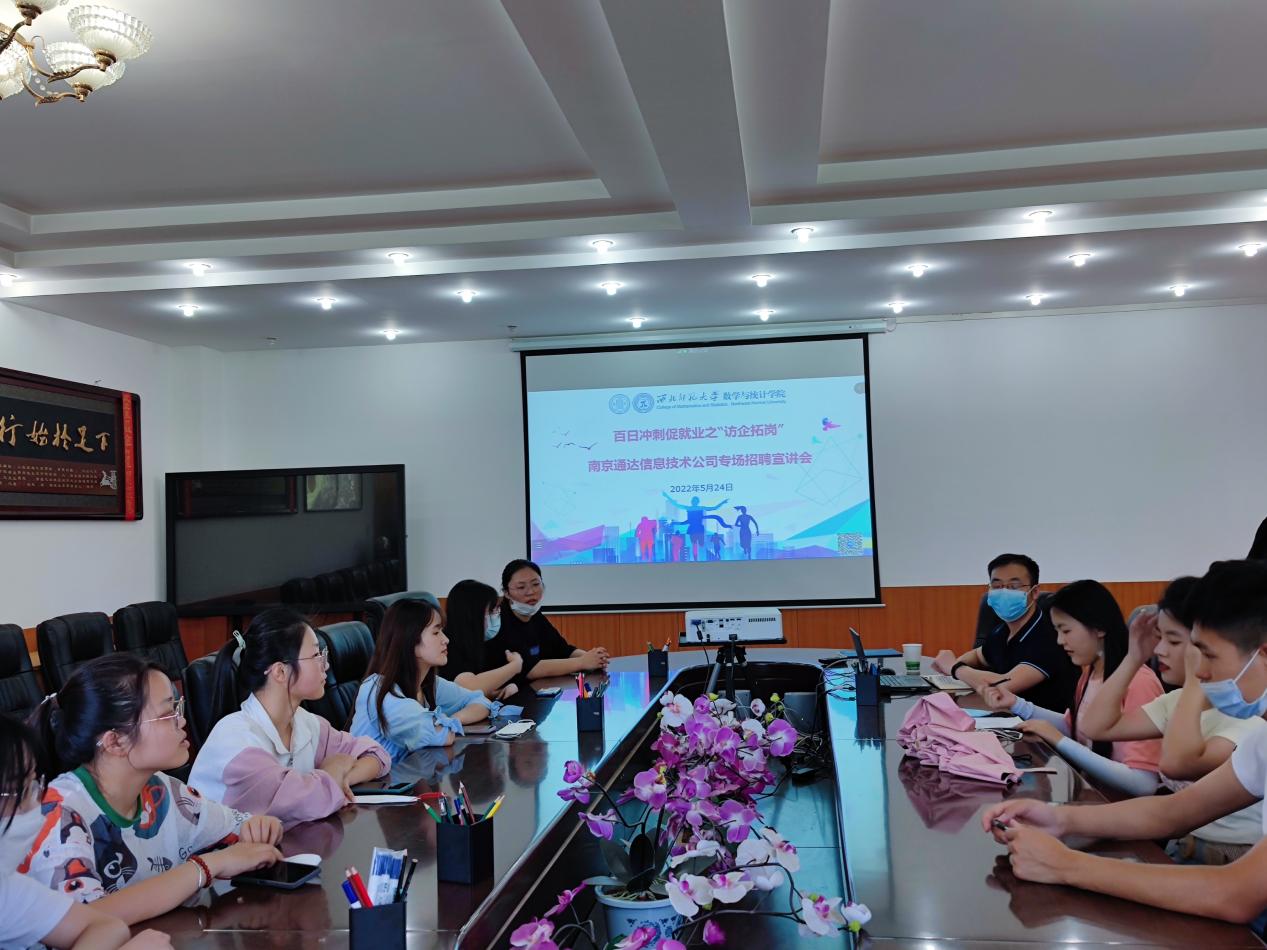 为贯彻落实党中央、国务院“稳就业”“保就业”决策部署,认真推进落实《太阳成集团tyc官网2022年毕业生就业市场开拓方案》,公司于2022年5月24日下午15:00在公司9B311会议室举行了南京通达信息技术公司线上专场招聘宣讲会。公司邀请了南京通达信息技术公司兰州分公司冯总经理进行线上宣讲,公司党委副书记张向东主持会议。