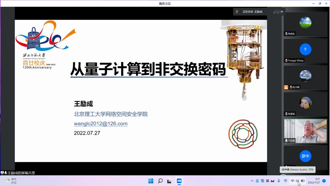 7月27日上午第2场报告,北京理工大学王励成教授重点介绍了从量子计算到非交换密码的发展脉络和相关研究成果。