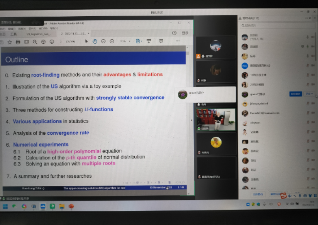 11月13日,来自中国人民大学的田茂再教授、南方科技大学的田国梁教授、西安交通大学的朱学虎教授、湖北大学的刘展教授、苏州大学的马学俊教授、中华人民共和国商务部的戴明峰研究员、河南理工大学的刘中强教授和兰州财经大学的肖强教授等8位专家分别做了《Censored Quantile Transformation Models and Its Applications》《The upper-crossing/solution (US) algorithm for root-finding with strongly stable convergence》《Specification testing of regression models with mixed discrete and continuous predictors》和《A propensity score adjustment method for longitudinal time series models under nonignorable nonresponse》《Distribution estimation for model regression》《政务大数据建设与运营若干思考》《Subgroup adaptive randomization and model-based adaptive randomization for heteroscedasticity of treatment responses》和《中国金融压力指数的测度及其宏观经济非线性效应分析》的精彩报告。8位专家在报告中分享了他们最新的研究成果,并与公司统计学专业师生进行了亲切互动。报告结束后,副经理乔虎生教授做了总结讲话,鼓励研究生积极开展高水平的科研工作并向与会专家请教学习。报告会由肖鸿民教授、田玉柱副教授、张建东博士和边丽娜博士联袂主持。