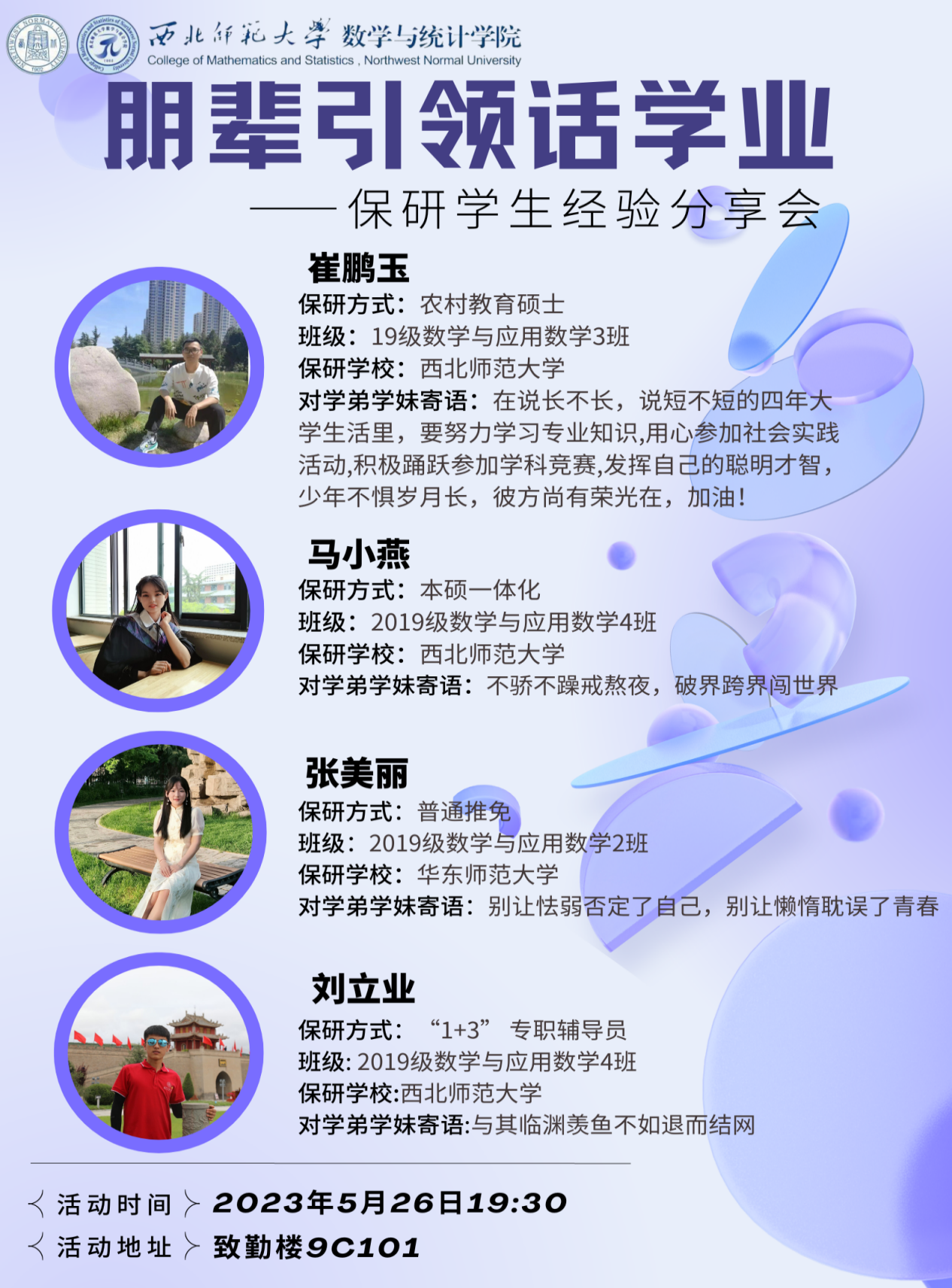 为增强员工学习主动性,充分发挥榜样示范以及朋辈引领作用,公司于5月26日19:30在致勤楼9C101举办“朋辈引领话学业——保研员工经验分享会”系列活动第二期,本期邀请2019级数学与应用数学2班张美丽、3班崔鹏玉、4班马小燕以及4班刘立业四位同学进行保研经验分享,会议由包佳佳老师主持。