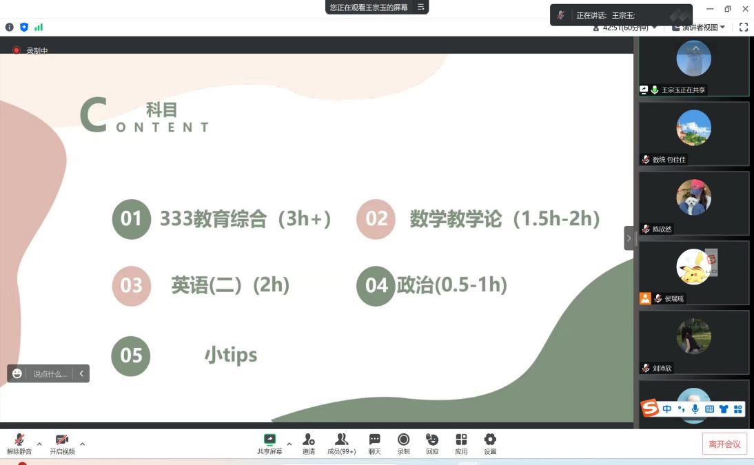 王宗玉同学分享了333教育综合、数学教学论、英语(二)和政治四门学科的学习方法,并提醒大家考研路上一定要善于计划、有效利用网络资源、注重劳逸结合。更重要的是,她通过讲述去年疫情期间考研备考的各种艰难,让同学意识到今非昔比,激励同学们要更加珍惜当下美好的时光,奋力拼搏,一战成硕。