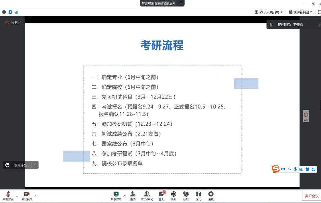 王婧赟同学从考研流程、初试科目以及心得体会三个方面进行分享,同时推荐了优质考研学习资料和公众号,她勉励大家“不要停止奔跑,不要回顾来路。来路无可眷恋,值得期待的只有前方”。