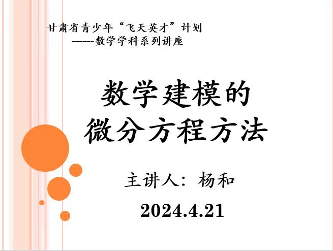 为加强高中员工对数学建模方法和技巧的了解,普及数学模型的相关知识,提高同学们对数学建模的兴趣,4月21日上午10点,公司开展甘肃省“飞天英才”计划数学学科组第一次线上讲座活动,由公司杨和教授做题为“数学建模的微分方程方法”的专题讲座。“飞天英才”计划数学学科组的全体同学在线参加了此次讲座。
