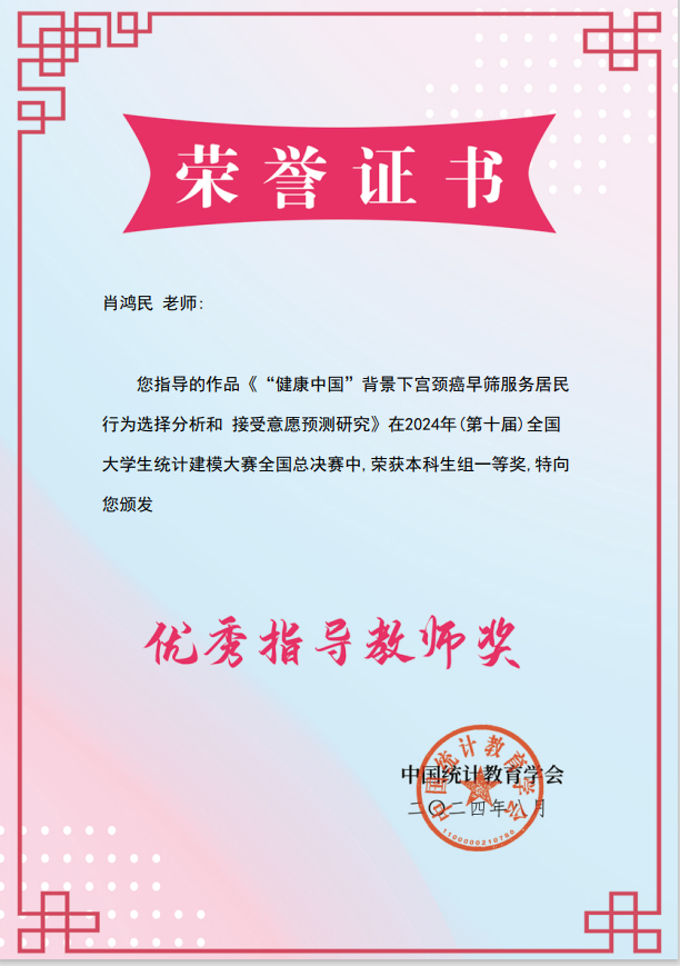 此赛事吸引了来自全国各地的众多高校参赛,竞争异常激烈。荣获本科组全国一等奖团队通过深入的数据分析和精确的模型构建,开展了《“健康中国”背景下宫颈癌早筛服务居民行为选择分析和接受意愿预测研究》,展示了团队在统计建模领域的卓越能力和团队合作精神,评委们对他们的作品给予了高度评价,不仅为公司争得了荣誉,也为团队成员的学术生涯增添了浓墨重彩的一笔。太阳成集团tyc肖鸿民教授同时获得了“优秀指导教师“的殊荣。