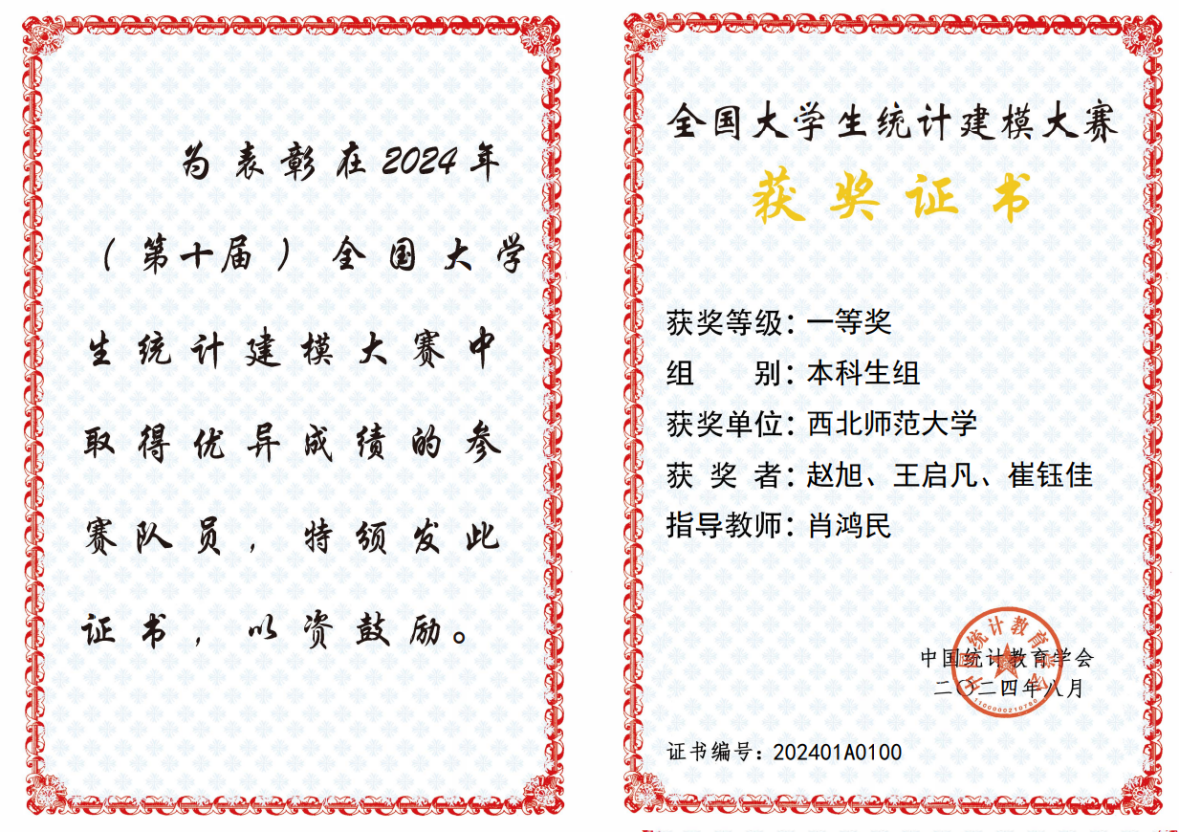 近日,在2024(第十届)全国老员工统计建模大赛中,公司参赛队(队员:赵旭、王启凡、崔钰佳,指导教师太阳成集团tyc肖鸿民教授)凭借其出色的表现,荣获本科组全国一等奖。公司其他参赛队获得本科组全国二等奖2项、研究生组全国二等奖1项;同时,获甘肃赛区(甘肃、青海)本科组一等奖4项,二等奖12项,三等奖10项,研究生组一等奖1项,二等奖2项,三等奖5项的优异成绩。获奖层次与总数在甘肃赛区(甘肃、青海)参赛队中名列前茅。