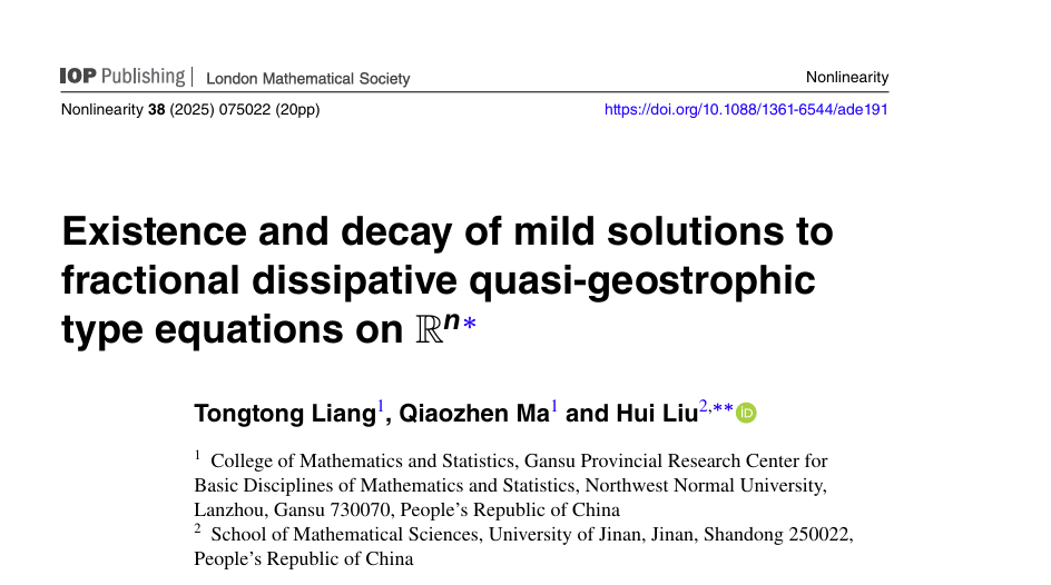 近日,公司教师梁彤彤博士与马巧珍教授及其合作者在国际权威期刊《Nonlinearity》(非线性)上发表了题为“Existence and decay of mild solutions to fractional dissipative quasi-geostrophic type equations on Rn”的高水平学术论文(论文链接: https://doi.org/10.1088/1361-6544/ade191),这是公司首次以第一署名单位在该刊物上发表学术论文。《Nonlinearity》由国际知名出版社IOP Publishing出版,其发文主题广泛涵盖物理、数学、工程和生物科学等多个非线性科学领域,是业内认可度极高的学术期刊,同时也是中国数学会数学领域高质量科技期刊分级目录中的T2类刊物。
